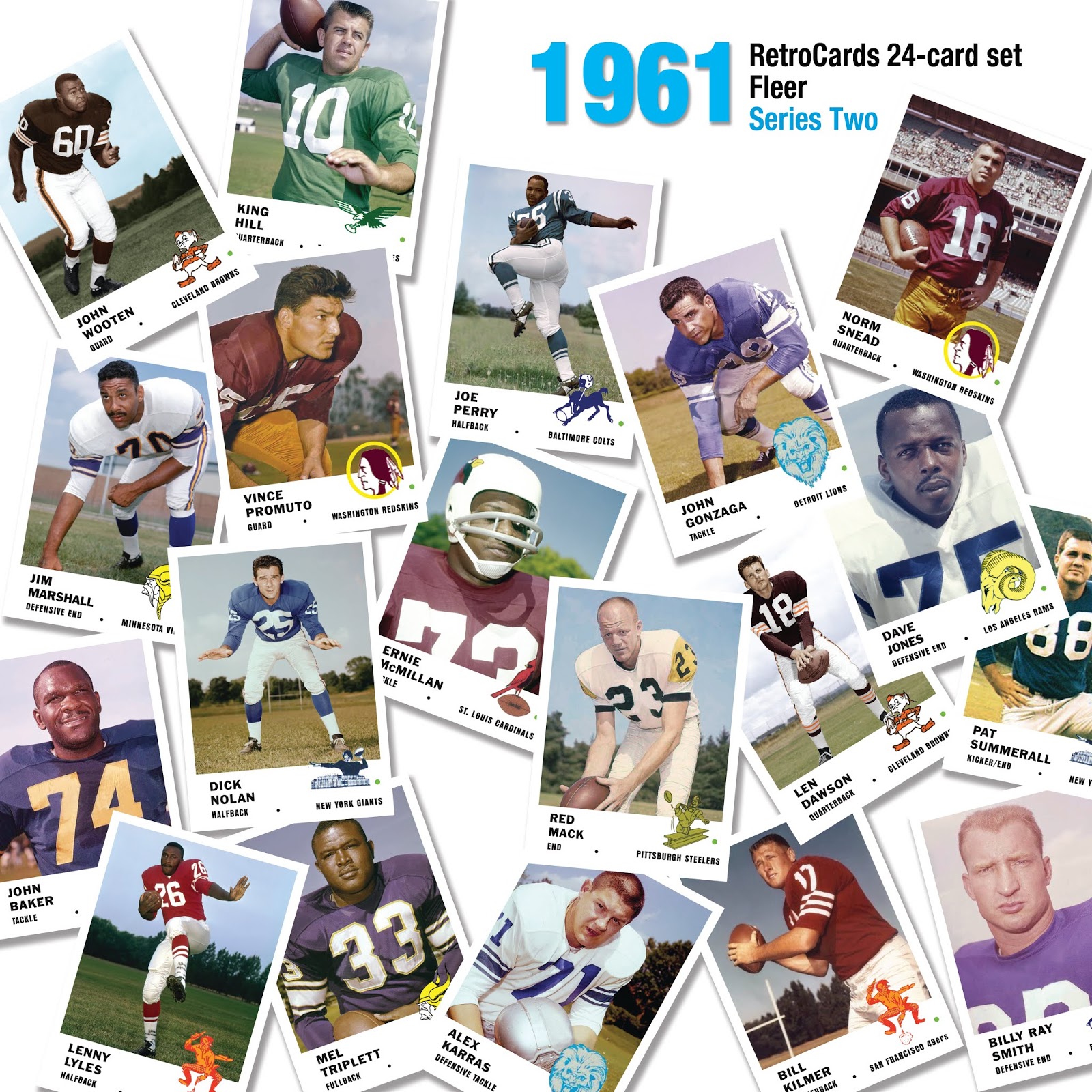 The 1961 Fleer RetroCards series continues with s second set of NFL players. This set features 24 more NFL players who didn't have cards in the 1961 Fleer set: John Wooten, King Hill, Joe Perry, Vince Promuto, John Gonzaga, Jim Marshall, Dick Nolan, Dave "Deacon" Jones, Norm Snead, J.D. Smith, Billy Ray Smith, Ernie McMillan, Red Mack, Lenny Lyles, John Baker, Len Dawson, Pat Summerall, Mel Triplett, Alex Karras, Billy Kilmer, Palmer Pyle, Danny Villanueva, and Lou "the Toe" Groza.