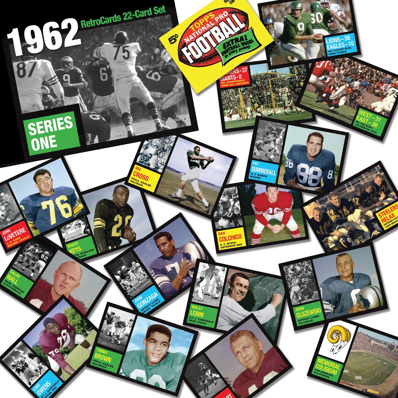 Many collectors have commented on the beauty of the 1962 NFL football set with its dark borders and black and white action photos coupled with an attractive portrait of the player. RetroCards has created and additional 230 cards – released in 10 series, six of which are team sets. Several team sets that have been previously released (Dallas Cowboys, Green Bay Packers, Baltimore Colts, Chicago Bears, and Cleveland Browns), will be updated to fit into the new numbering system of Series 1-4, and a new Minnesota Vikings team set will be forthcoming. Series 1-4 will contain the eight teams which have not been represented in the team sets. These series will also include playoff cards, head coach cards, league & team highlights, and stadium cards for each team.
