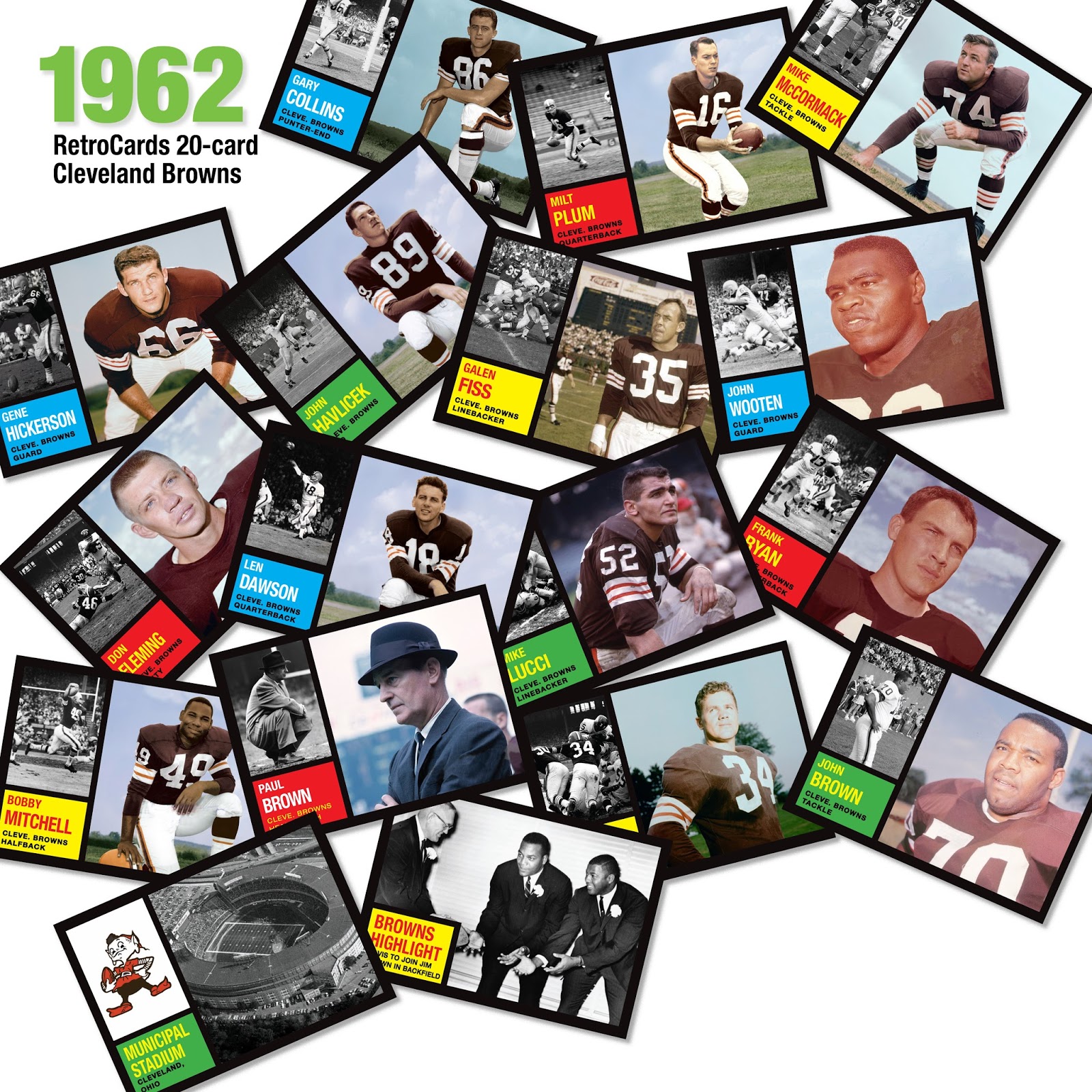 Nonetheless, the Browns fielded a formidable team with the likes of key offensive linemen John Wooten, John Brown, and Mike Mccormack, who helped Jim Brown become the greatest in the game. These and others are the subject of this RetroCards set. Rookies Mike Lucci, Gary Collins, and Fred Cox are included plus Galen Fiss, Mike McCormack, Gene Hickerson, Leon, Clarke, Walt Michaels, Frank Ryan, Bobby Mitchell, Don Fleming, and Len Dawson. There is even a card of newly drafted John Havlicek who opted for the world of basketball after attending the Browns training camp in 1962. Like other 1962 sets by RetroCards, a team stadium card is included, a highlight card of Jim Brown welcoming rookie Ernie Davis, as well as a coach card for Hall of Famer Paul Brown. Get it here.