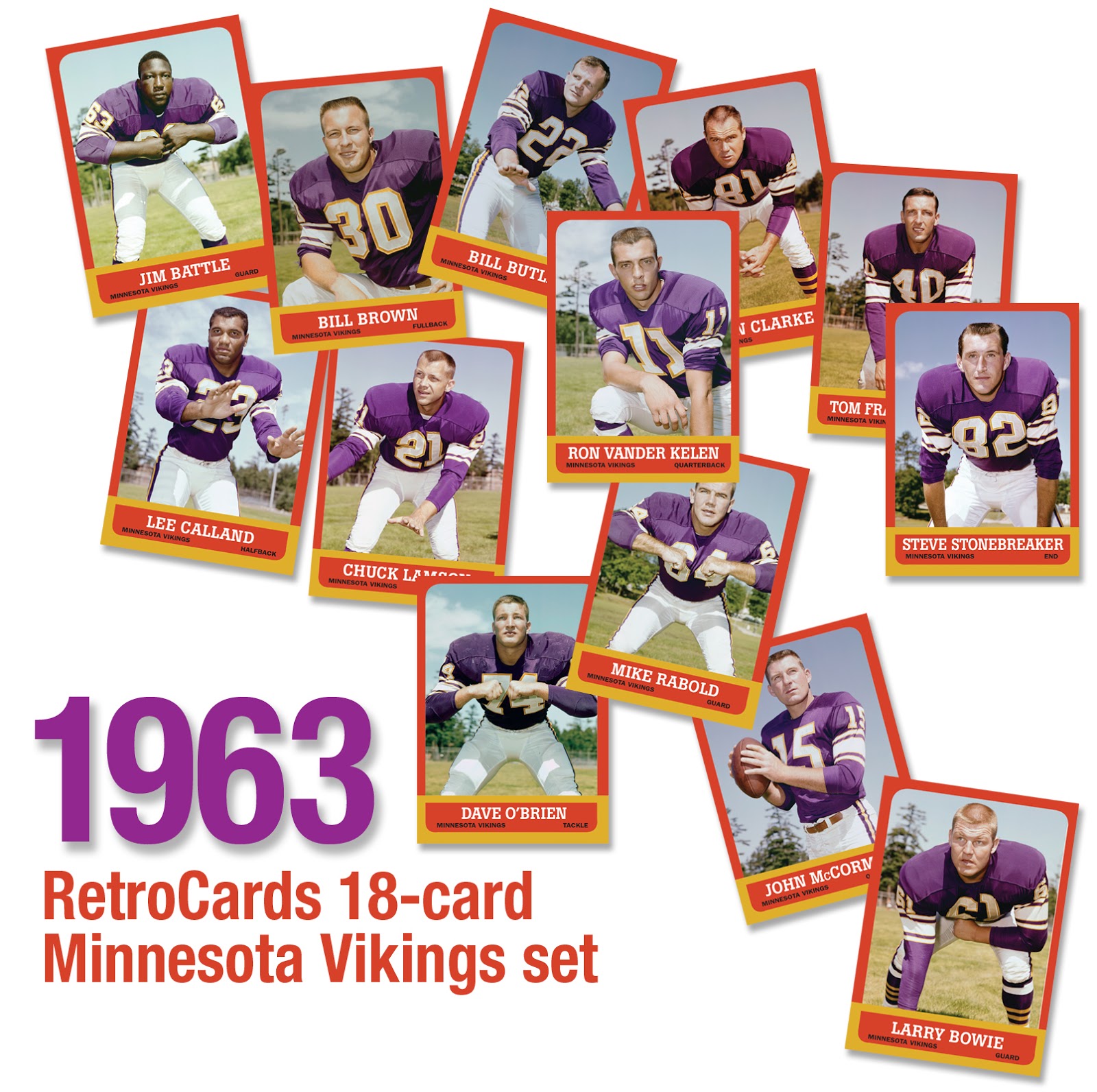 RetroCards introduces it's first Minnesota Vikings set with this 1963 classic design. Starters like Bill Brown, Larry Bowie, Steve Stonebreaker, Lee Calland, and Don Hultz are featured in this set plus young back ups like Ron Vander Kelen, Bill Butler, and Gordie Smith. Rookies Jim Battle, Ray Poage, and Dave O'Brien make first appearances in this extended 1963 set. Order your set here!