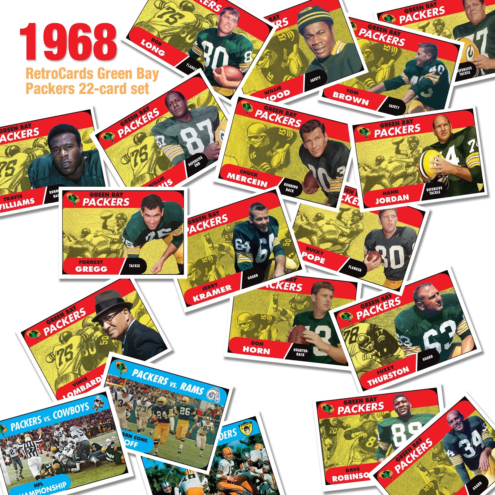 RetroCards fills in many Packer gaps with this 22-card set featuring Hall Of Famers Willie Wood, Henry Jordan, Willie Davis, Forrest Gregg, Dave Robinson, coach Vince Lombardi. Other overlooked players are Travis Williams, Tom Brown, Ron Kostelnik, Bob Long, Jerry Kramer, Don Horn, Fuzzy Thurston, Don Chandler, Lee Roy Caffey, Bucky Pope, Chuck Mercein, Bob Skoronski, Lionel Aldridge, plus three post season cards featuring the 1967 Packer playoff appearances. Get yours here.