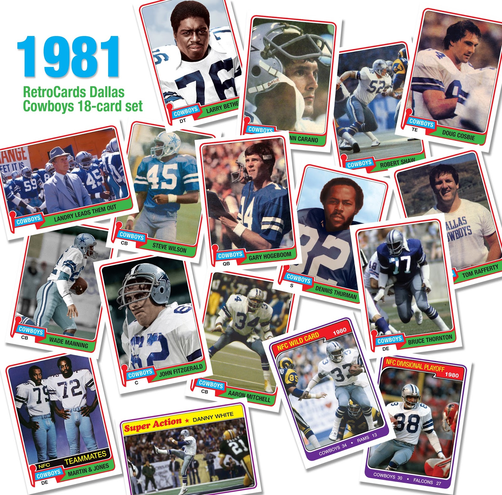 This 18-card RetroCards set features players that did not appear on a regular card in 1981. The set includes: Bruce Thornton, Tim Newsome, Larry Bethea, John Fitzgerald, Robert Shaw, Doug Cosbie, Steve Wilson, Dennis Thurman, Gary Hogeboom, Tom Rafferty, Aaron Mitchell, Glenn Carano, Wade Manning, a team card featuring Tom Landry, an In-Action card of Danny White, and a “teammates” card featuring Harvey Martin and Ed “Too Tall” Jones. Also included are playoff cards of the NFC Wild Card vs. Rams and the NFC Divisional Game vs. Falcons. Get it here!