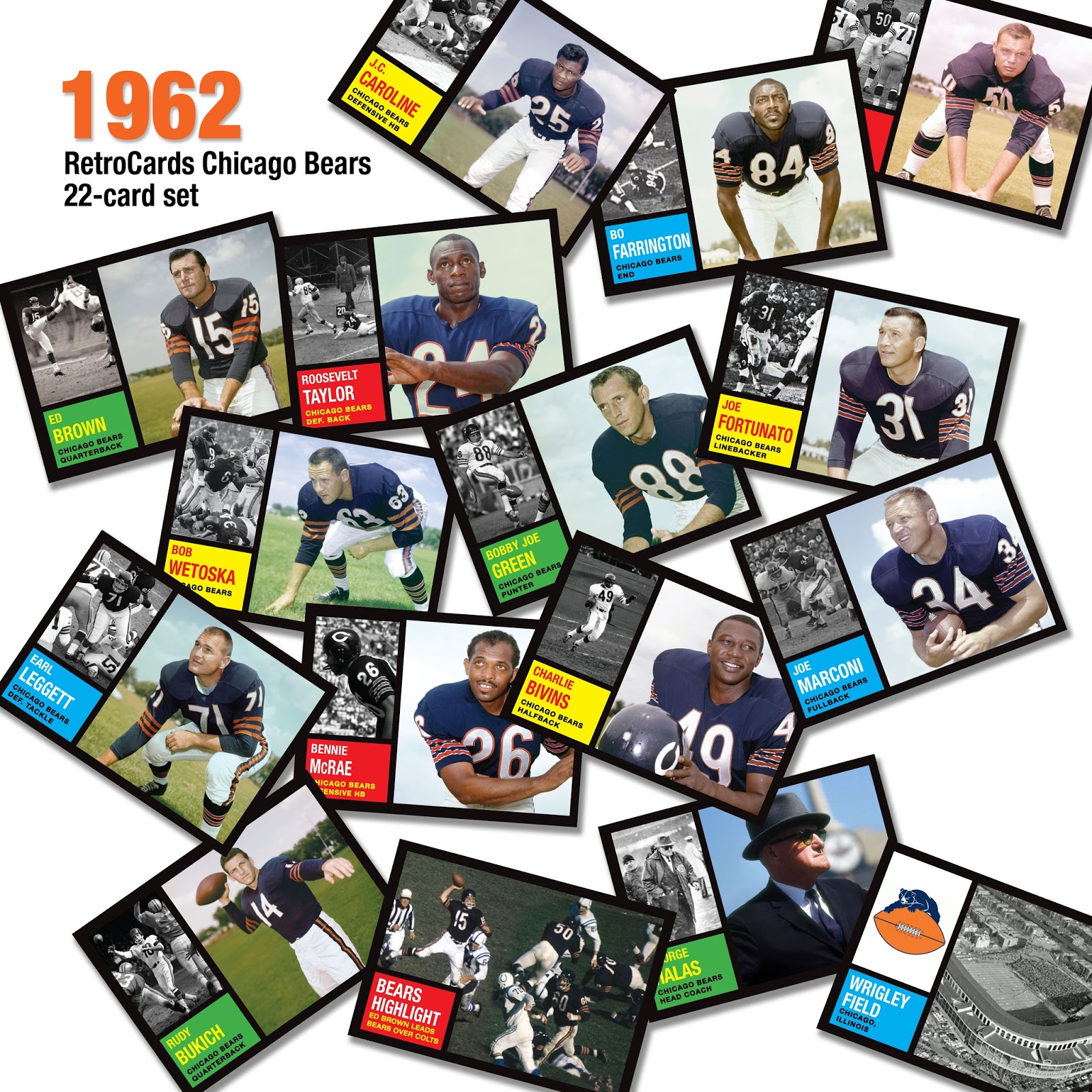 RetroCards focuses on the 1962 Bears for this 22-card set. Like several past sets, this one includes a stadium card, and a "Bears play" action card along with 20 players that didn't make it in the original set released in 1962, including Mike Pyle, J.C. Caroline, Ed Brown, Bo Farrington, Dave Whitsell, Bennie McRae, Bob Wetoska, Bobby Joe Green, Roosevelt Taylor, Bob Kilcullen, Joe Fortunato, Fred Williams, Harlon Hill, Herman Lee, Earl Leggett, Charlie Bivins, Rudy Bukich, Maury Youmans, Joe Marconi, and the old man himself, coach George Halas. Get your set here!