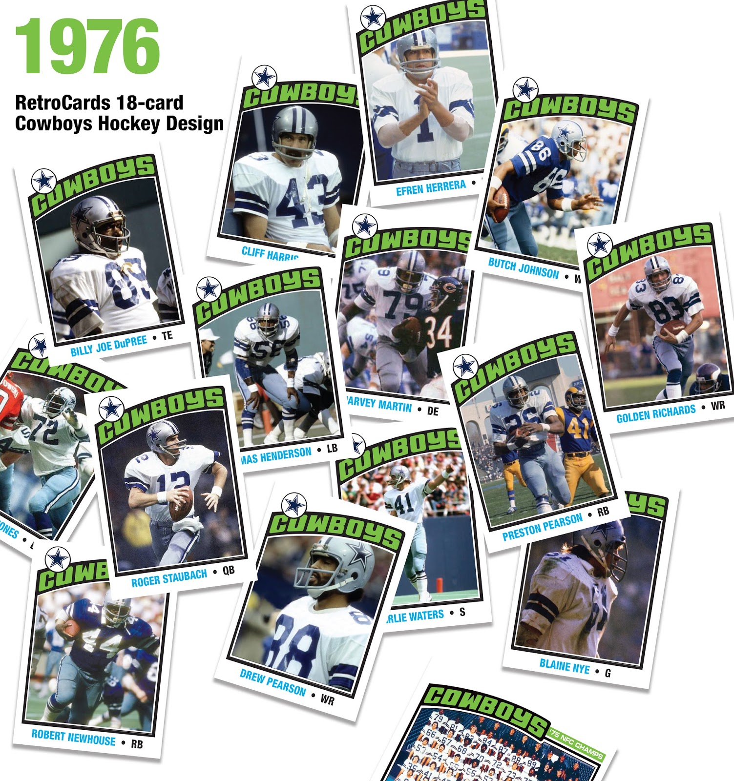This set includes: Roger Staubach, Preston Pearson, Harvey Martin, Butch Johnson, John Fitzgerald, Blaine Nye, Drew Pearson, Golden Richards, Too Tall Jones, Cliff Harris, Rayfield Wright, Charlie Waters, Billy Joe Dupree, Robert Newhouse, Thomas Henderson, Efren Herrera, Tom Landry, and a team card. Order yours here!