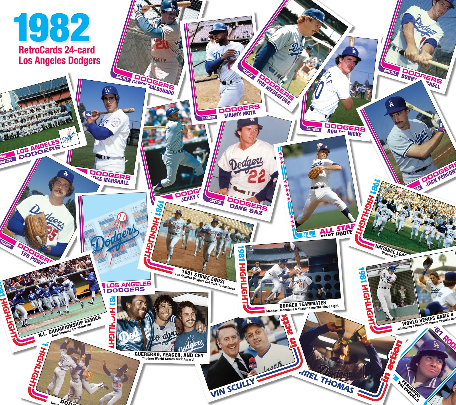 This 24-card RetroCards set fills in some gap of players that were missed in the regular and updates sets of 1982 such as: Manny Mota, Tom Niedenfuer, Ron Roenicke, Mike Marshall, Jerry Grote, Jack Perconte, Bobby Mitchell, Dave Sax, Ted Power, and Candy Maldonado. Also featured are an All-Star card of Burt Hooten and a Cy Young and Rookie Of the Year winners showcasing Valenzuela. It also has cards of every playoff series including three fun World Series cards and other highlight cards featuring Tommy Lasorda being interviewed by Vin Scully, and the very fun card of Rick Monday shoving a cream pie in Jay Johnstone’s face. Those were the days! Coming soon.