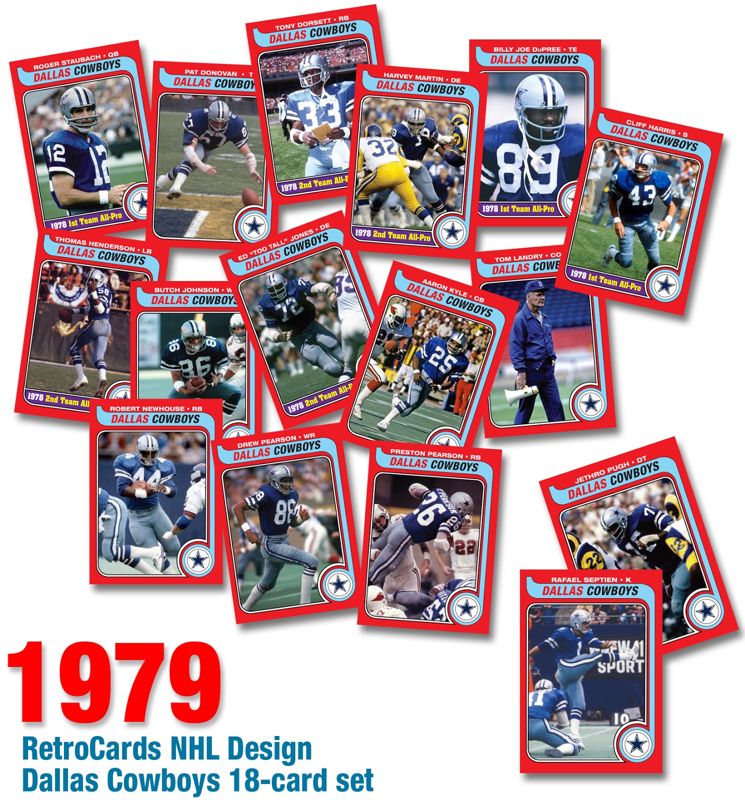 Players include: Tony Dorsett, Roger Staubach, Robert Newhouse, Pat Donovan, Preston Pearson, Butch Johnson, Billy Joe Dupree, Drew Pearson, Danny White, Jethro Pugh, Bob Breunig, Ed “Too Tall” Jones, Aaron Kyle, Harvey Martin, Cliff Harris, Thomas Henderson, Rafael Septien, and Tom Landry. Get them here.