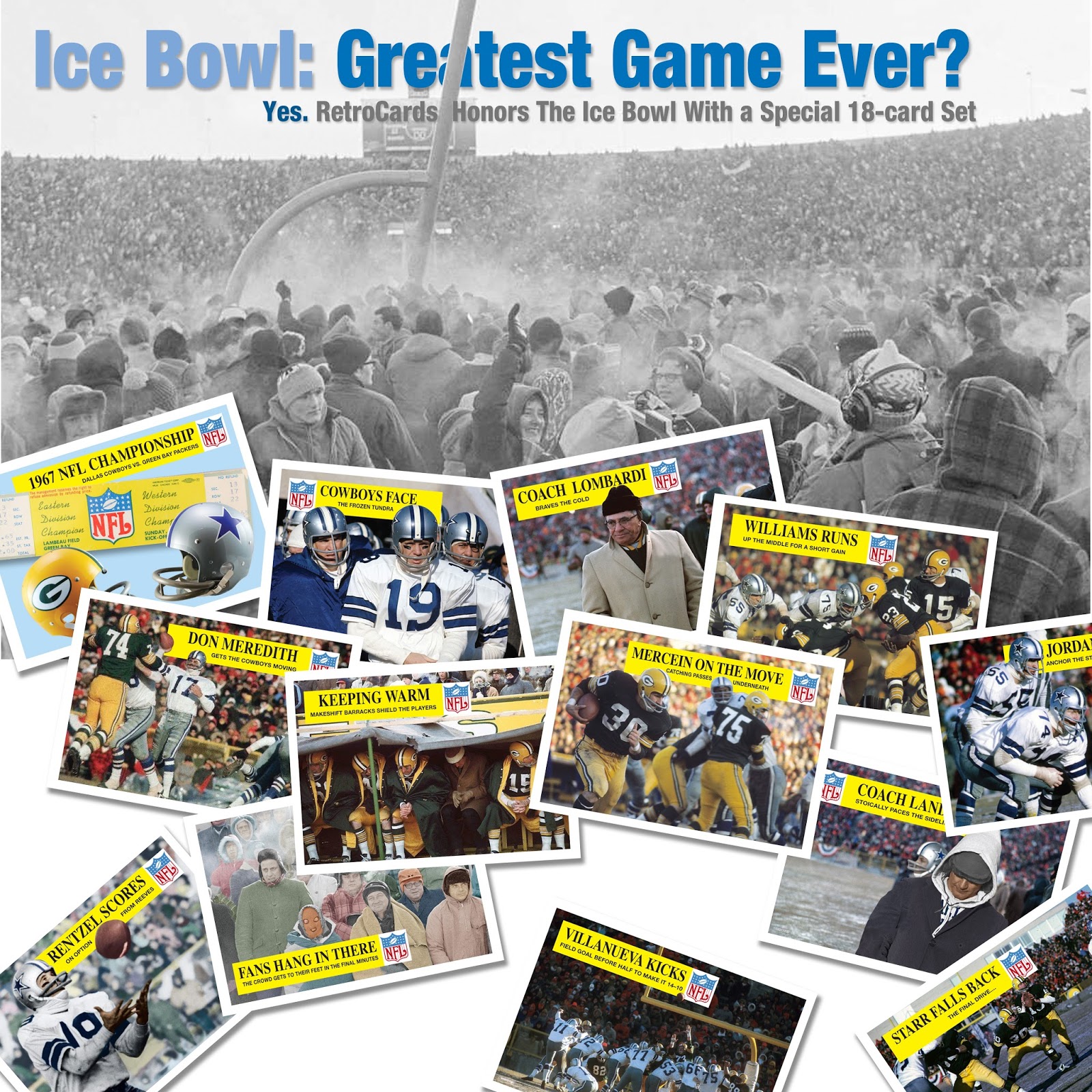 Players featured included Bart Starr, Boyd Dowler, Chuck Mercein, Travis Williams, Vince Lombardi, Jerry Kramer, Don Meredith, Danny Villanueva, Lance Rentzel, Dan Reeves, Bob Lilly, Lee Roy Jordan, George Andrie, Tom Landry, and of course, the fans. Order your set here.