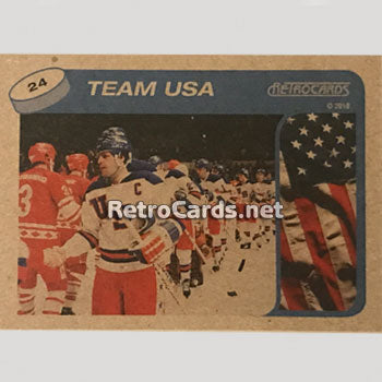 The 1980 USA Hockey team never had a proper period-style card set so RetroCards is delivering it. Here is the entire team: Bill Baker, Neal Broten, Jim Craig, Dave Christian, Steve Christoff, Mike Eruzione, John Harrington, Steve Janaszak, Mark Johnson, Rob McClanahan, Jack O.Callahan, Mark Pavelich, Buzz Schneider, Dave Silk, Eric Strobel, Bob Suter, Phil Verchota, and Mark Wells. Also featured is coach Herb Brooks, a team card, and two victory cards.